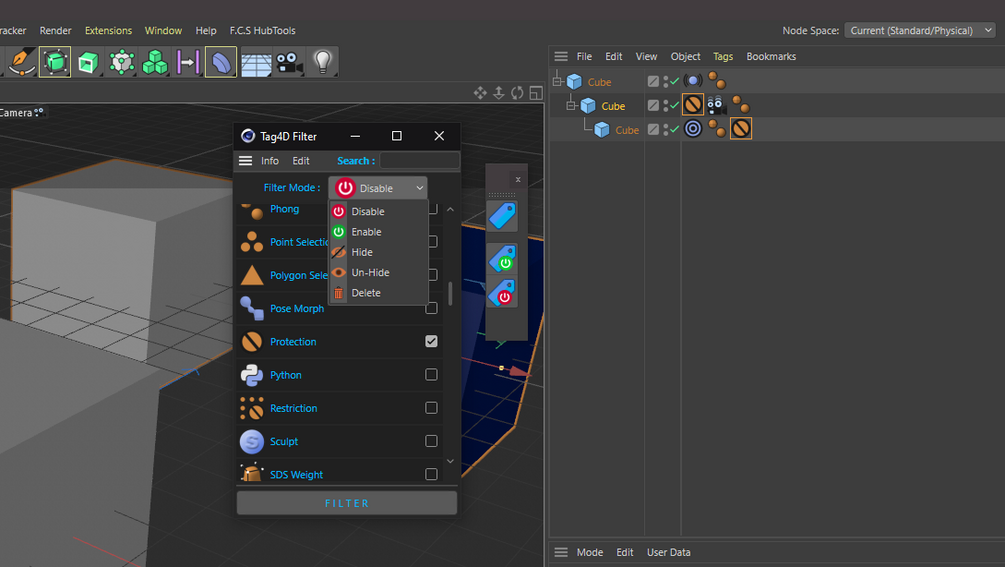Tag4D Filter is the most wanted feature that is now in Maxon Cinema 4D. Easily disable and enable the tags on your objects and also hide/un-hide and delete them.